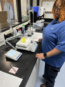Lab Analyst III Jarisha Binion calibrates the pH meter daily to ensure the instrument provides accurate and reliable readings—an essential step in monitoring and controlling the water treatment process. The pH meter measures the acidity or alkalinity of water, a key parameter that helps maintain water quality and safety. Over time, pH probes can drift due to factors such as electrode aging, residue buildup, or temperature fluctuations. By performing daily calibrations using standard buffer solutions, Jarisha ensures that all readings remain precise and dependable, supporting the delivery of clean and safe drinking water to our community.