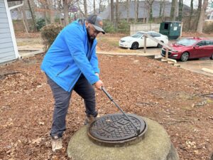 Mechanical Maintenance Specialist Brant Lackey lifts a manhole lid to inspect an air release valve (ARV) ahead of a planned replacement. This proactive inspection supports preventive maintenance efforts that help ensure the system’s continued reliability and safe operation.