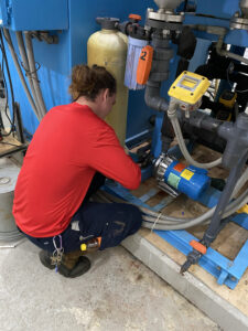 Kenneth Moore, Mechanical Maintenance, is installing a new deionized (DI) water pump on the ozone generator unit at the Water Treatment Plant. This upgrade ensures the ozone system operates efficiently and reliably, supporting the plant’s ability to produce safe, high-quality drinking water for Rockdale County residents.