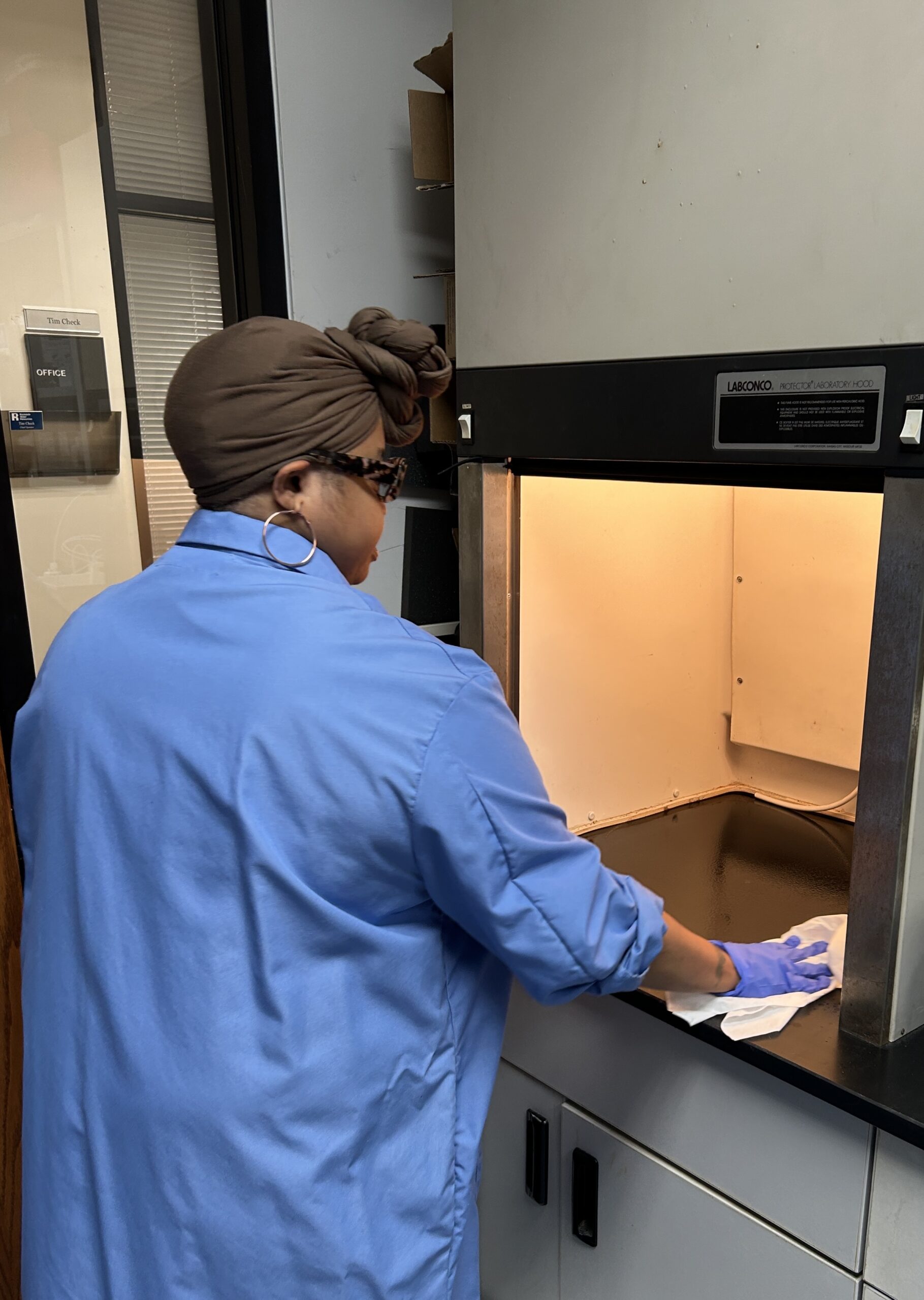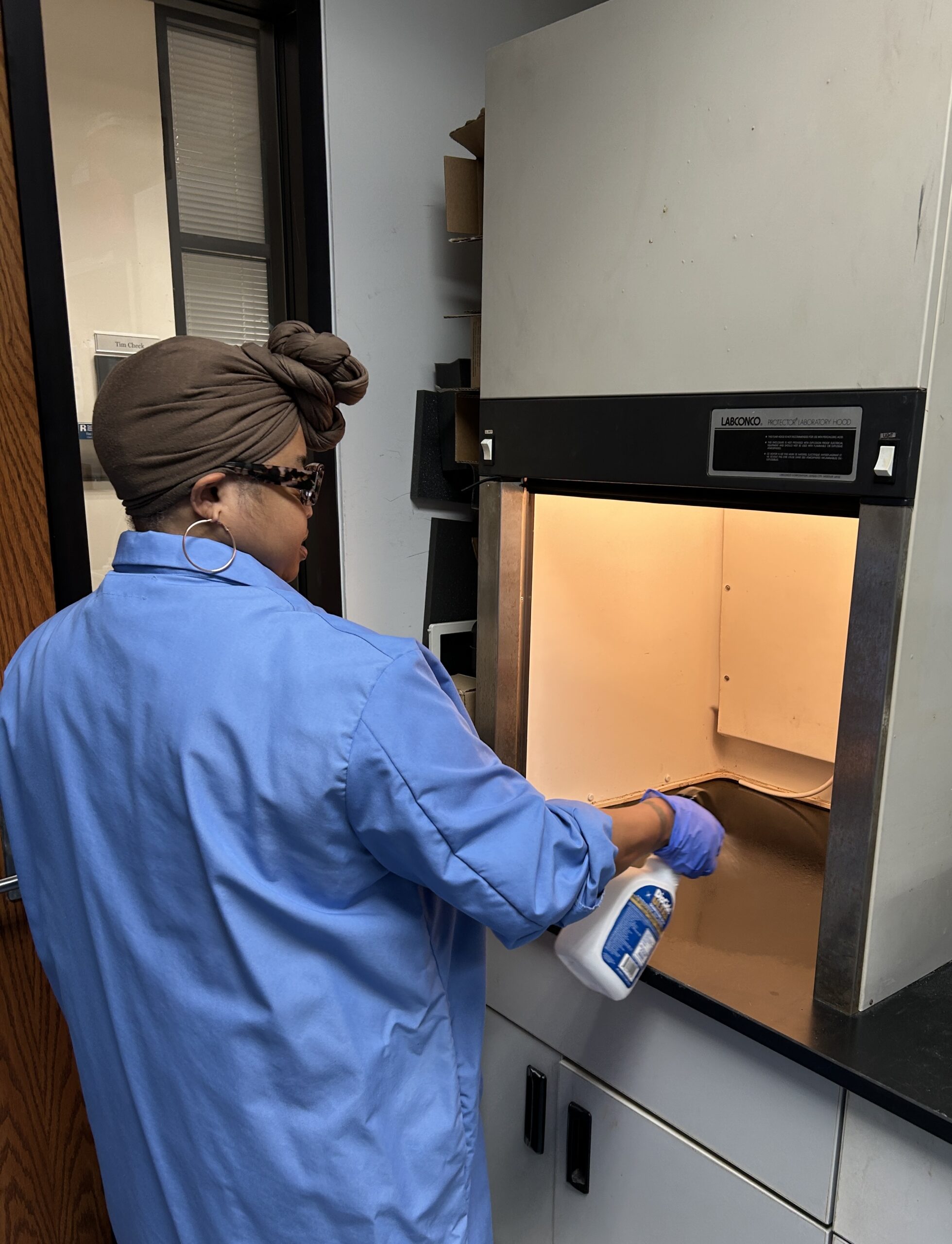 Lab professional Jarisha Binion is shown cleaning the laboratory fume hood as part of routine maintenance. Regular cleaning helps maintain a safe and contamination-free workspace by removing chemical residues, preventing cross-contamination between analyses, and supporting proper airflow. This essential practice protects laboratory personnel and ensures the accuracy and integrity of test results.