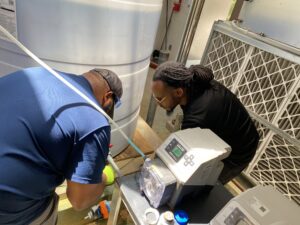 Mechanical Maintenance Specialists Yohance Spearman and Brant Lackey are shown installing a secondary Blue-White pump for the copper sulfate system at the intake facility. This upgrade provides added redundancy to the chemical feed process, helping ensure consistent treatment and improving overall operational reliability.