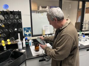 Lab Coordinator Jeff Cawley is shown measuring dissolved oxygen (DO) levels in a drinking water sample from the system. Dissolved oxygen is monitored to identify areas where elevated readings may occur, as high DO concentrations can accelerate corrosion within distribution pipes, potentially leading to main breaks and other infrastructure issues.