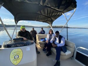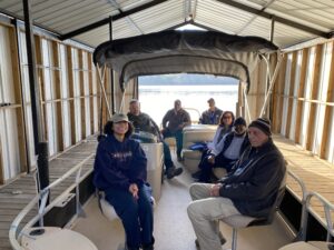 Leadership and key operations staff recently participated in a boat tour of Randy Poynter Lake to gain a firsthand look at current reservoir conditions and ongoing water supply efforts. Pictured before and during the tour are Chair & CEO JaNice Van Ness, Director Kimbry Peek, General Manager Richard Davis, Water Treatment Plant Manager Vernoy Murray, Chief Operator Tim Check, and Mechanical Maintenance Coordinators George Archer and Ahava Peters.